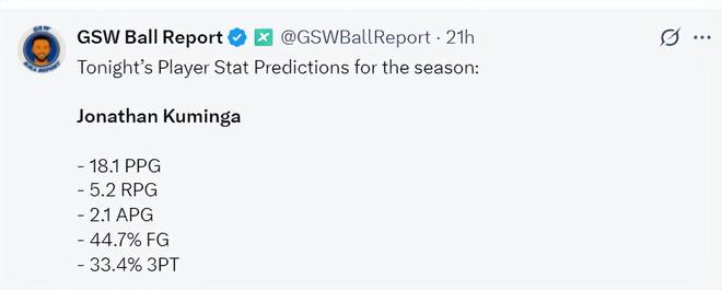 勇士媒体预测新赛季库明加场均能拿到18.1分5.2篮板2.1助攻,命中率44.7%,三分命中率33.4%。上赛季库明加场均15.3分4.6篮板2.2助攻,命中率45%,三分命中率31%。