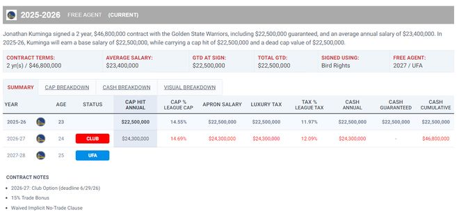 北京时间10月5日,NBA记者埃文-斯迪瑞透露,乔纳森-库明加与勇士队签下的合同实际上是两年4680万,而不是两年4850万,因为这份合同包含了15%的交易保证金,勇士队为了凑齐15人名单,库明加25-26赛季的起薪只能是2250万。