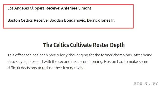 媒体FW也没闲着,趁常规赛还没有开始,他们策划快船可以跟绿军交易。从具体方案来看的话,快船可以抄底双能卫安芬尼-西蒙斯,而两名替补轮换博格丹-博格达诺维奇和小德里克-琼斯,由于新赛季戏份减少,可能就会被快船抛弃了。